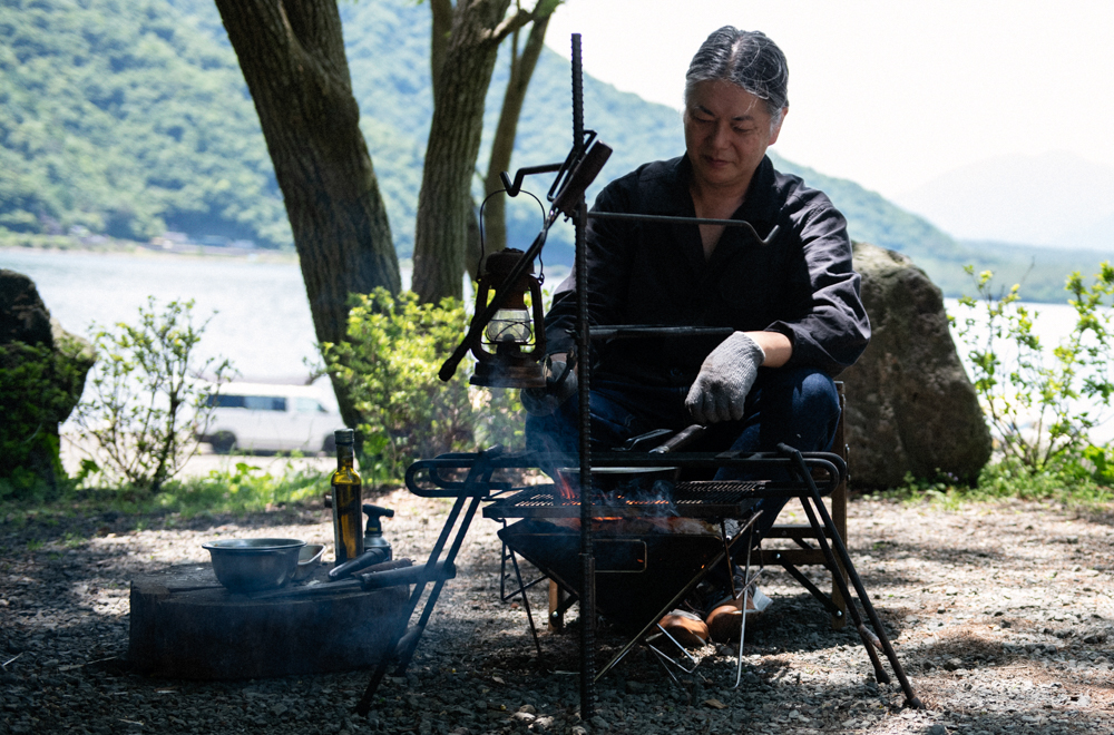 「キャンプは贅沢ですが、同時に不便でもありますね。火を起こして、ご飯を作って寝るだけですが、それが実は結構大変。普段の生活の中では、便利にすることで、かわりに抜け落ちているものがあると思います。例えば、お湯を沸かしてコーヒーを淹れるだけでも、本当は時間がかかる。その時間を短縮するための道具はたくさんありますが、その間に、人、環境、食材、道具とのコミュニケーションがあったはず。まずは、人、環境とのコミュニケーション。話をしたり、風を感じたり、鳥の鳴き声を聞いたり。調理中には、調理道具や、食材ともコミュニケーションが取れる。肉を焼くときも、いつになったら焼けるんだろう、まだかな、というように。集中して料理だけを一生懸命やるのもいいですが、ひと息ついて、休憩して、顔を上げて、五感を使う大切さをここに来ると思い出します」