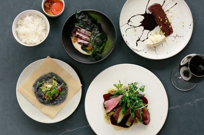 和牛のうちもも肉をライスポットで低温調理した後、薪火で香ばしく焼き上げ、赤ワインのソースと青胡椒のオイルで仕上げました。