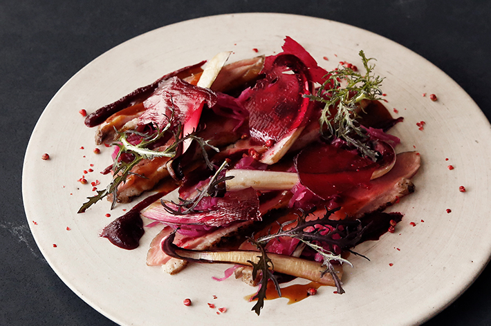 ◇ライスポットで低温調理した鴨胸肉の薪火ロースト 無水調理したビーツのピュレ グリーンペッパーのソース
