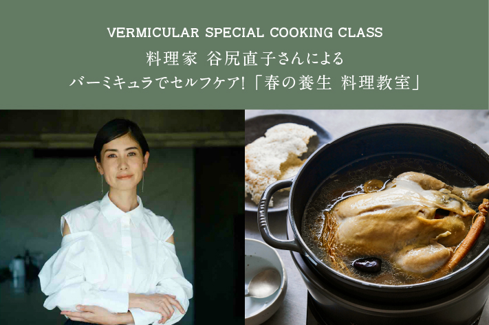 バーミキュラ製品を愛用されている料理家 谷尻直子さんを講師に迎え、バーミキュラ ライスポットで作る「サムゲタン」を中心に、ご家庭でも気軽に楽しめる食養生メニューをクッキングデモンストレーション形式でご紹介します。デモンストレーションをご覧いただいた後は、実際にお料理をお召し上がりいただけます。春の体をやさしく整える、滋味深いひとときをぜひお楽しみください。※お土産付き